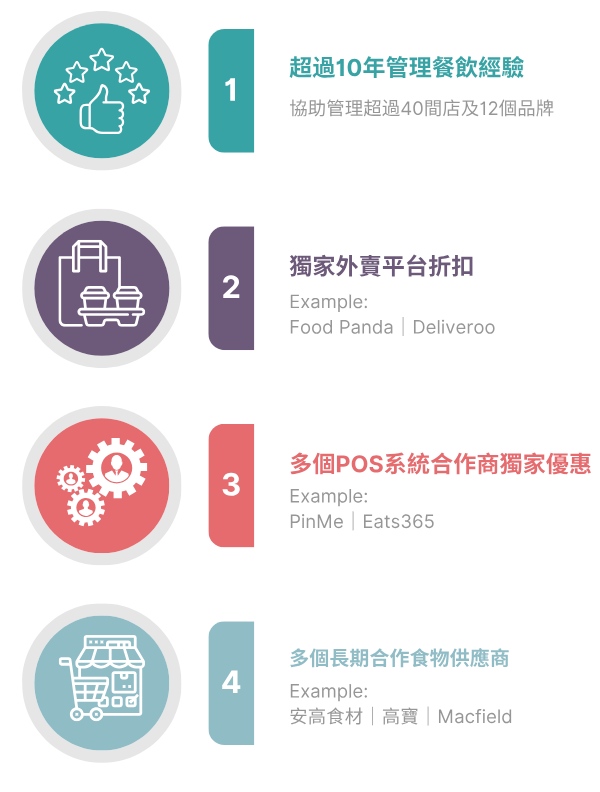 - 多個POS系統合作商 E.g PinMe, Eats365